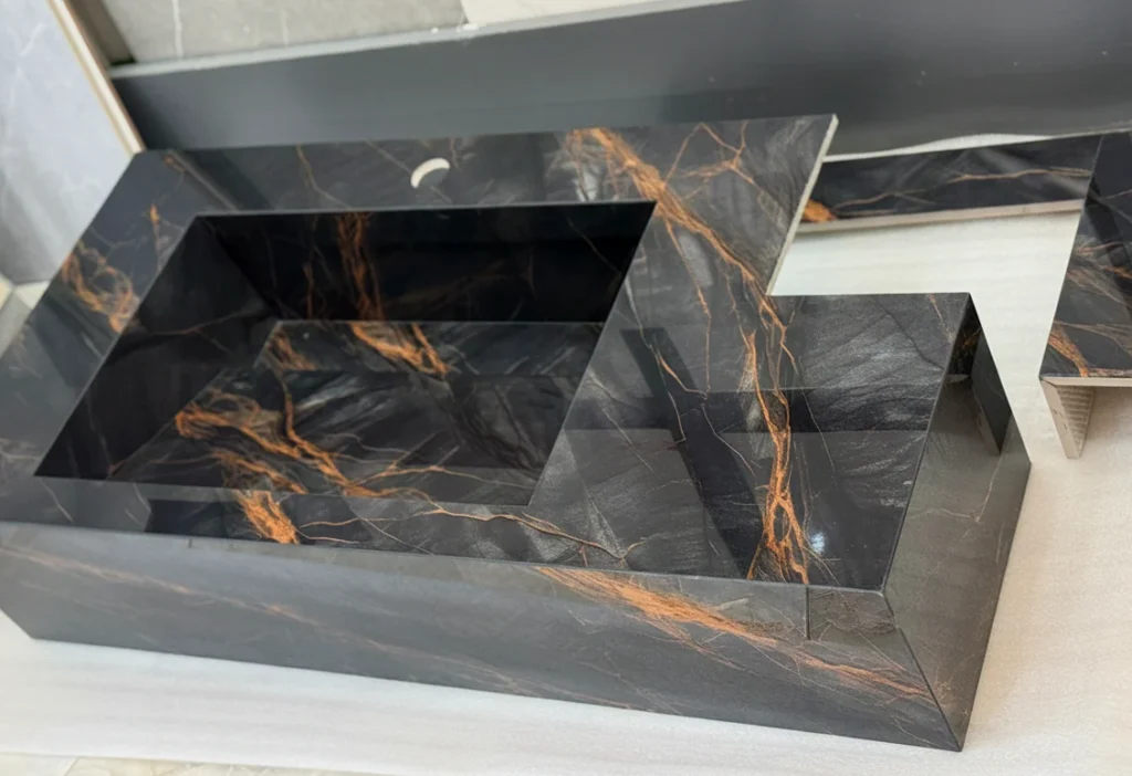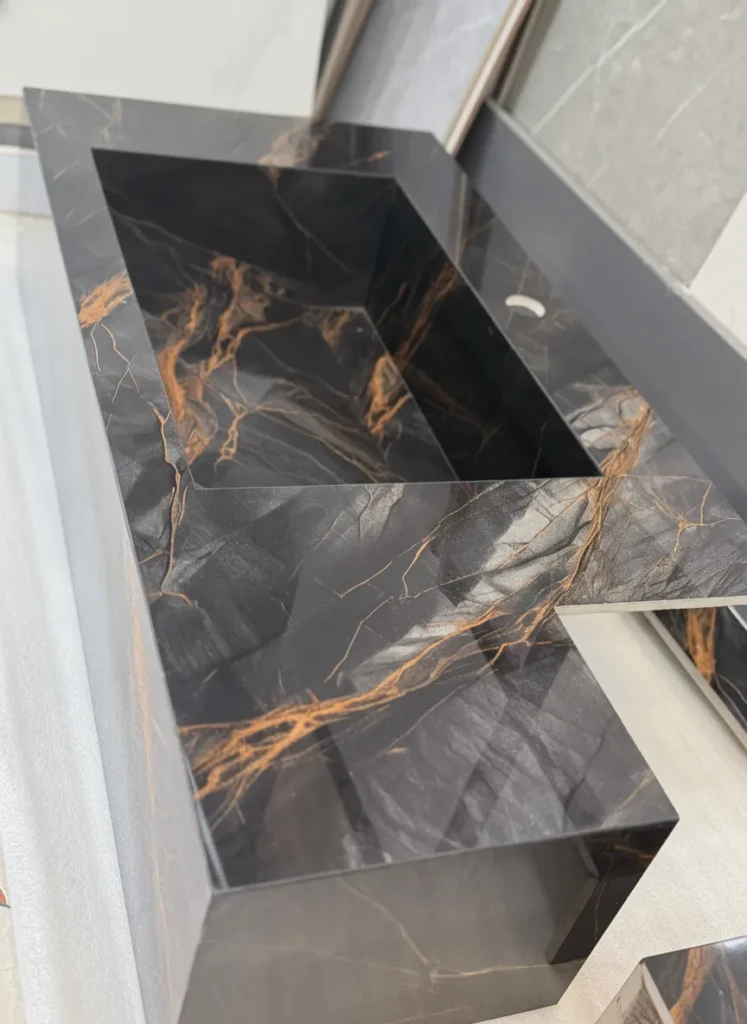 روشویی سرامیکی دیواری (شناور) یکپارچه | ۵۵×۴۰ | مشکی با رگههای طلایی | مدل Onyx | کد CM-VS-003 | بدون کابینت