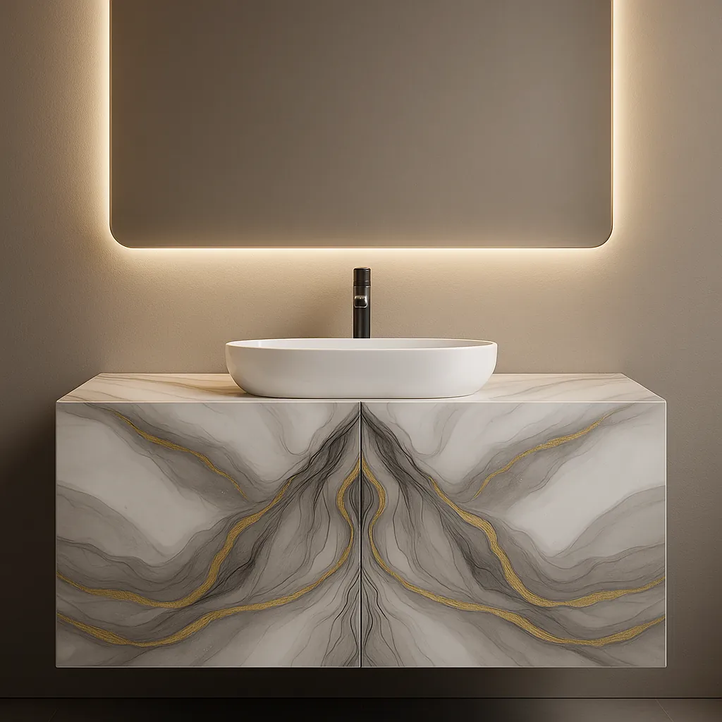 روشویی سرامیکی دیواری (شناور) 55×55 | طوسی روشن با رگههای ملایم طلایی/خاکستری | کد CM-VS-013 | بدون کابینت