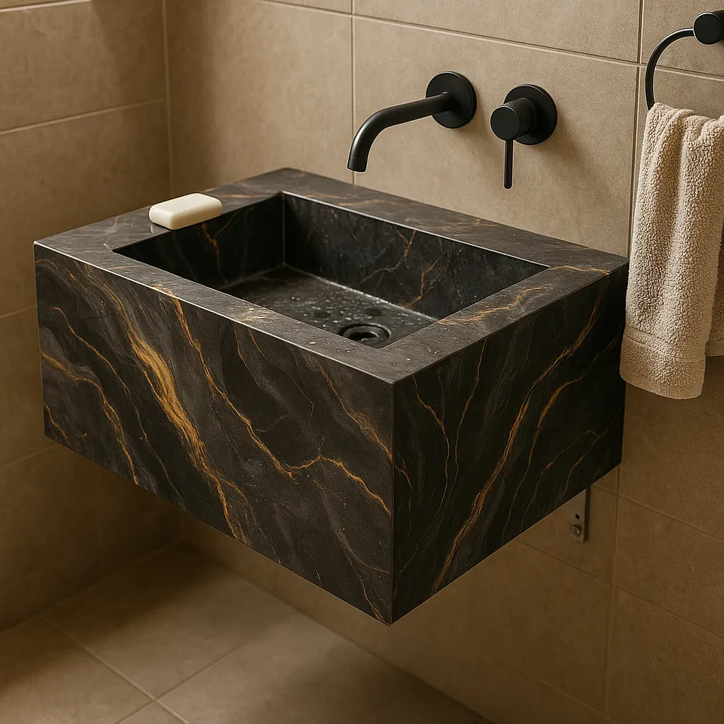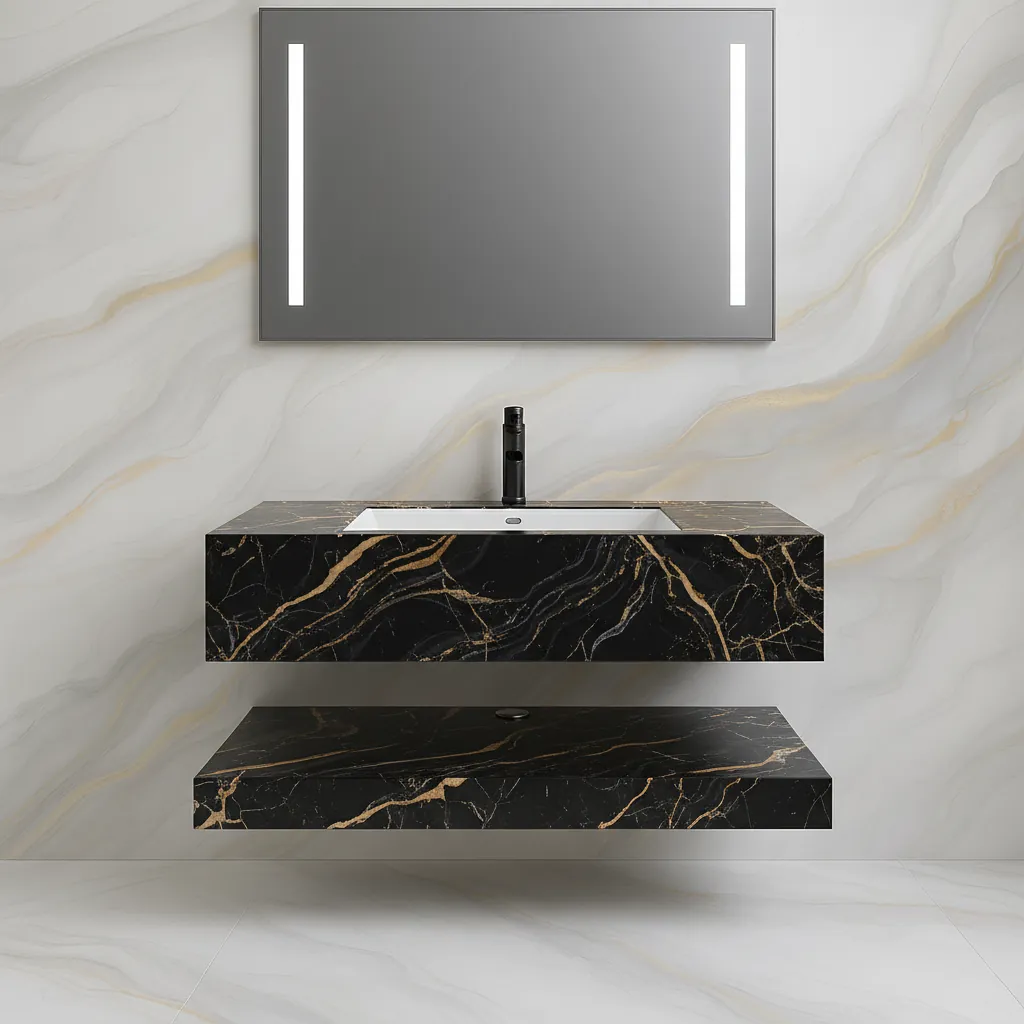 روشویی سرامیکی دیواری (شناور) | ۵۵×۴۰ | Noire Gold | مشکی رگه طلایی | کد CM-VS-001 | بدون کابینت