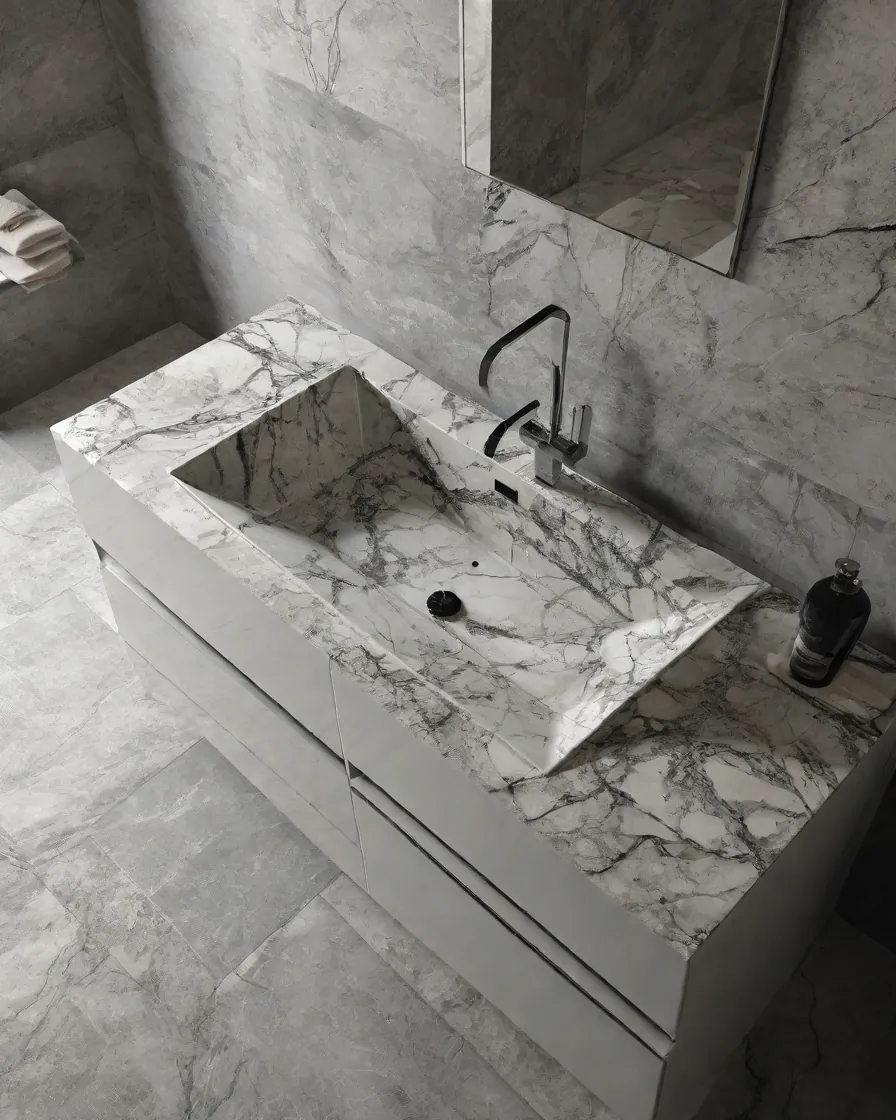 ست روشویی سرامیکی دیواری شلفدار دو طبقه | ۵۵×۴۰ | مدل Arc | طرح سنگ روشن رگه خاکستری | کد CM-VS-011 | بدون کابینت